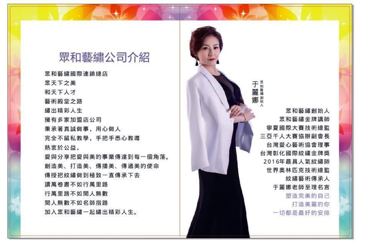 于丽娜是居住在台湾的东北人,在台北市已经发展了10多年时间,是众和艺绣美业创始人,从事纹绣眉、眼、唇的推广和教育育人事业,服务于18周岁至70周岁的客户群体,她有一句非常具有禅意的座右铭:“因上努力,果上随缘,因果循环,一切随缘。”正是这句“禅言”,指引着她平心静气地一心发展事业,成为了台湾地区美业界的翘楚。